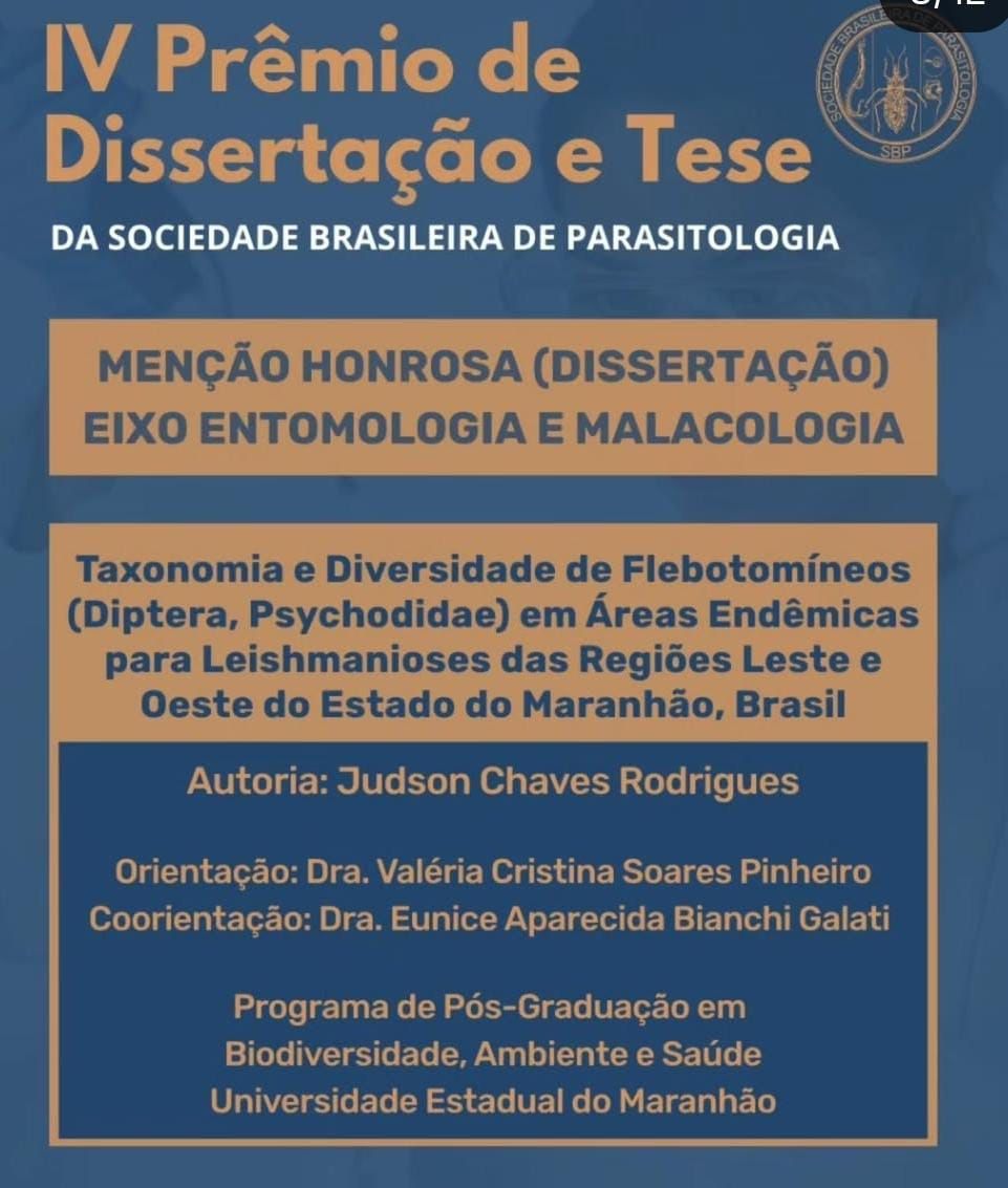 O Programa de Pós-Graduação em Biodiversidade, Ambiente e Saúde (PPGBAS/UEMA) parabeniza o egresso Mestre Judson Chaves Rodrigues, orientado pela Profa. Dra. Valéria Cristina Soares Pinheiro e coorientado pela Profa. Dra. Eunice Aparecida Bianchi Galati, pela Menção Honrosa recebida no IV Prêmio de Dissertação e Tese da Sociedade Brasileira de Parasitologia (SBP), no Eixo Entomologia e Malacologia.