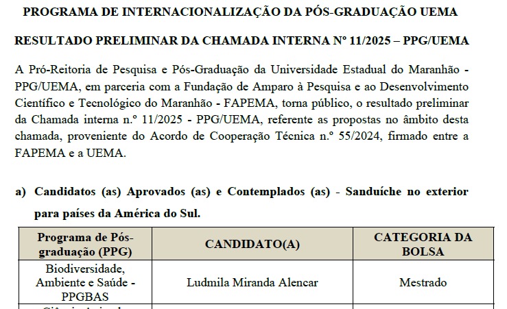 A seleção integra as ações institucionais voltadas ao fortalecimento da cooperação científica internacional, promovidas pela Pró-Reitoria de Pesquisa e Pós-Graduação (PPG/UEMA), em parceria com a Fundação de Amparo à Pesquisa e ao Desenvolvimento Científico e Tecnológico do Maranhão (FAPEMA). A iniciativa tem como objetivo ampliar a inserção internacional dos programas de pós-graduação, fomentando intercâmbios acadêmicos e o desenvolvimento de pesquisas em colaboração com instituições estrangeiras.